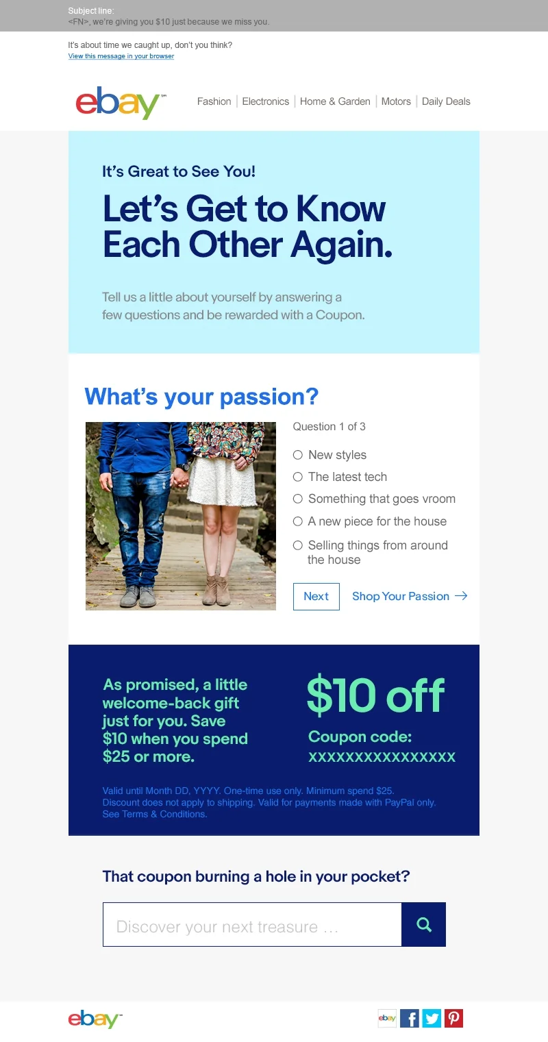 The Customer Relationship Management team is responsible for… well, managing relationships. I wrote a range of things for this client including email subject lines and content, landing page content, and display advertisements. Working with third-party developers we included new technology such as quizzes, hotspots and tabs into our emails. We also created a lot of personalized content such as populating a specific seller’s feedback or supplying different content depending upon a user’s shopping habits.